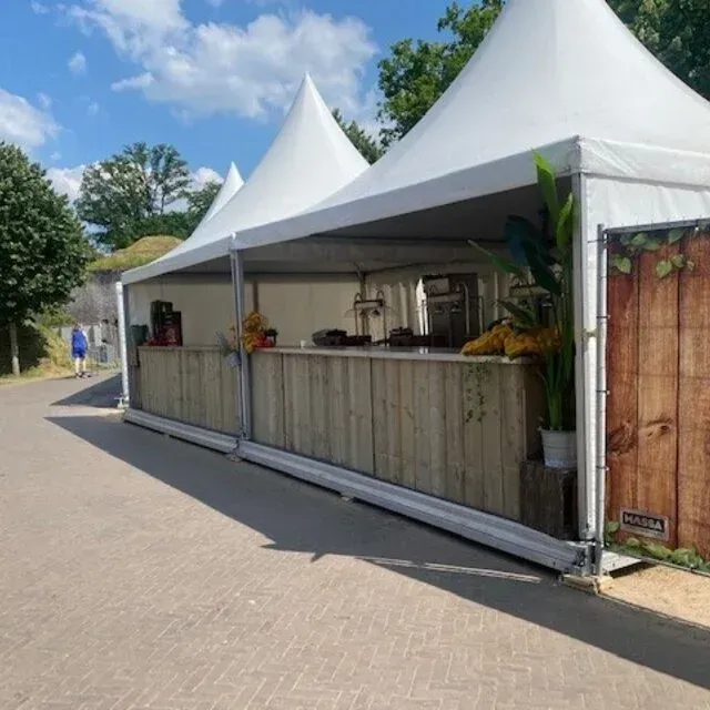 Onze pagodetenten zijn luxe en representatief. Deze tent is een echte blikvanger op het feest of op evenement. De pagodetent voldoet aan de strengste eisen vanuit de gemeente. De pagodetenten zijn inclusief de op en afbouw van de tenten